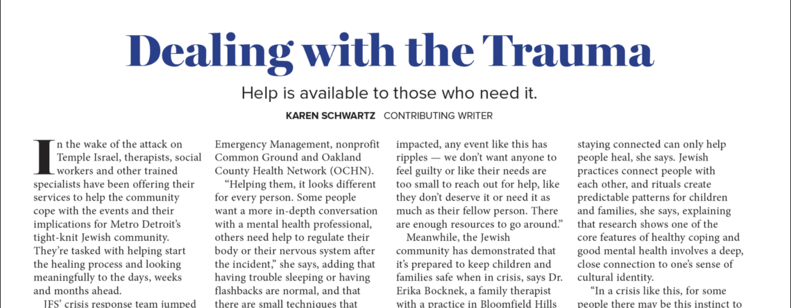 In the wake of the attack on Temple Israel, therapists, social workers and other trained specialists have been offering their services to help the community cope with the events and their implications for Metro Detroit’s tight-knit Jewish community. They’re tasked with helping start the healing process and looking meaningfully to the days, weeks and months ahead.